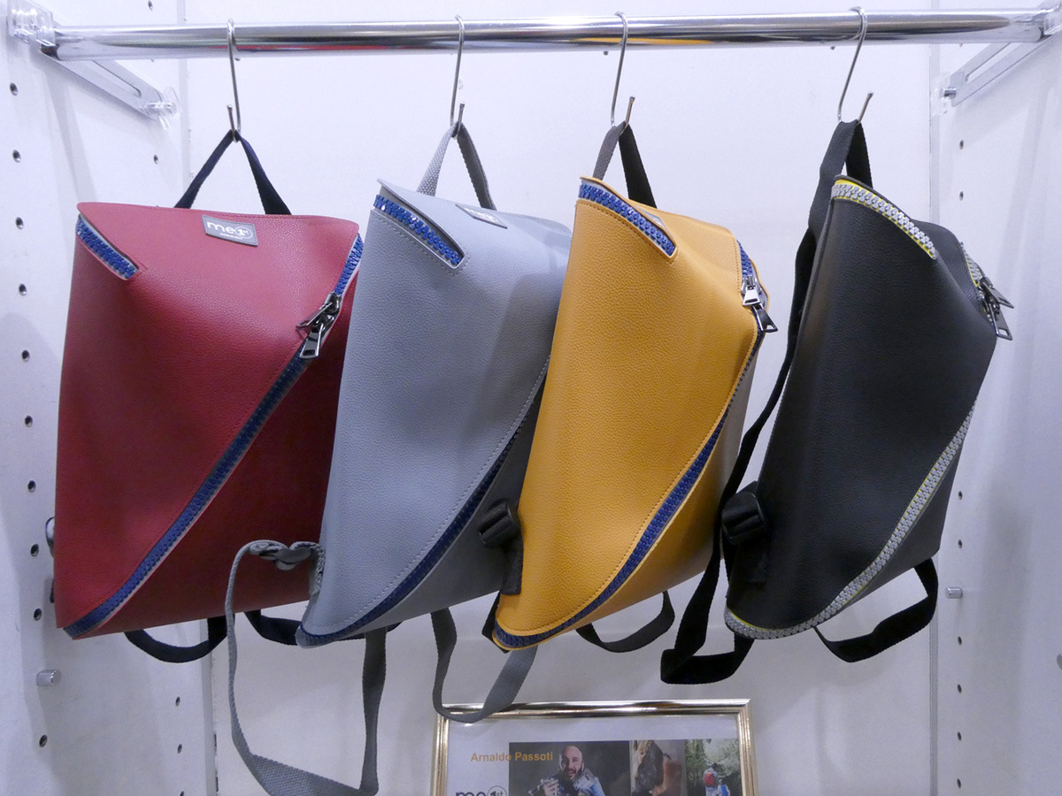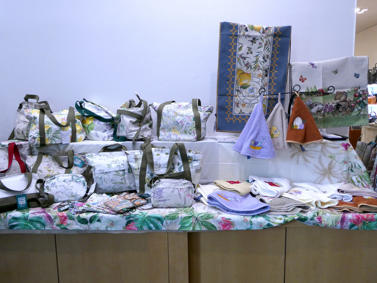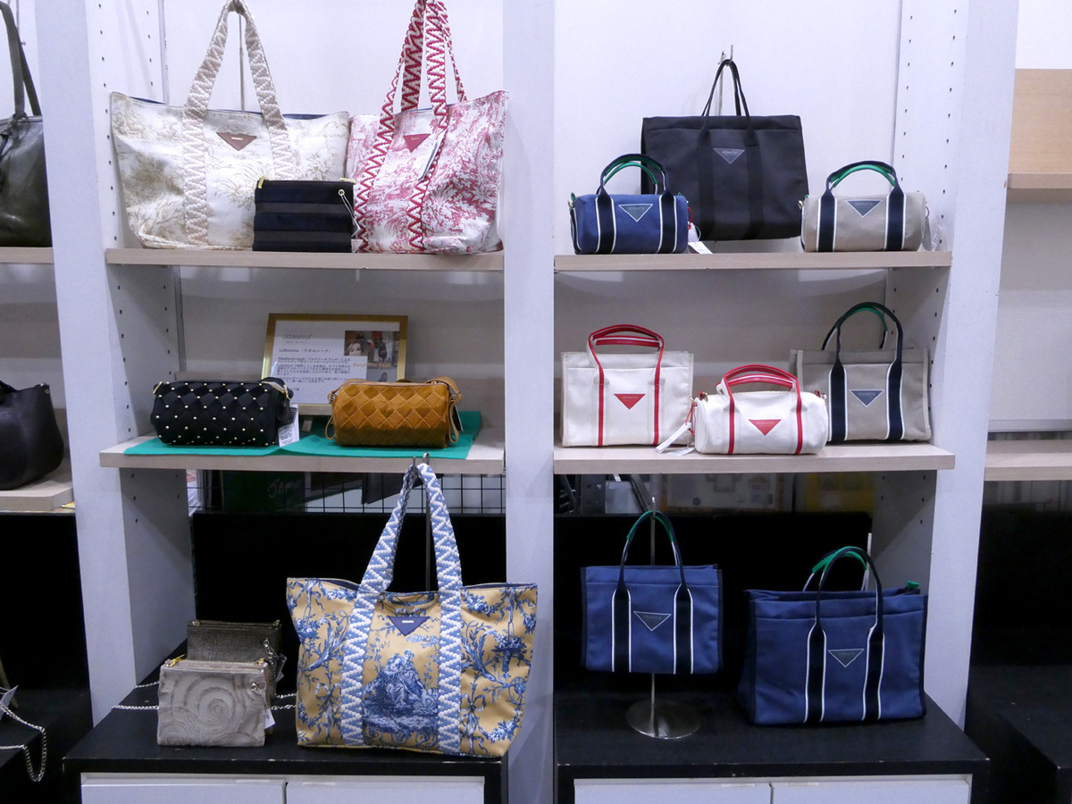 普段使いにちょうどバッグ。右側のタオルは広げると円形で中心にあるつまみで吊り下げることができる。通常のタオルよりも面積が広いので、手を拭いたときに乾いている部分が多くなるという利点がある。他にエコバッグなども販売されていた