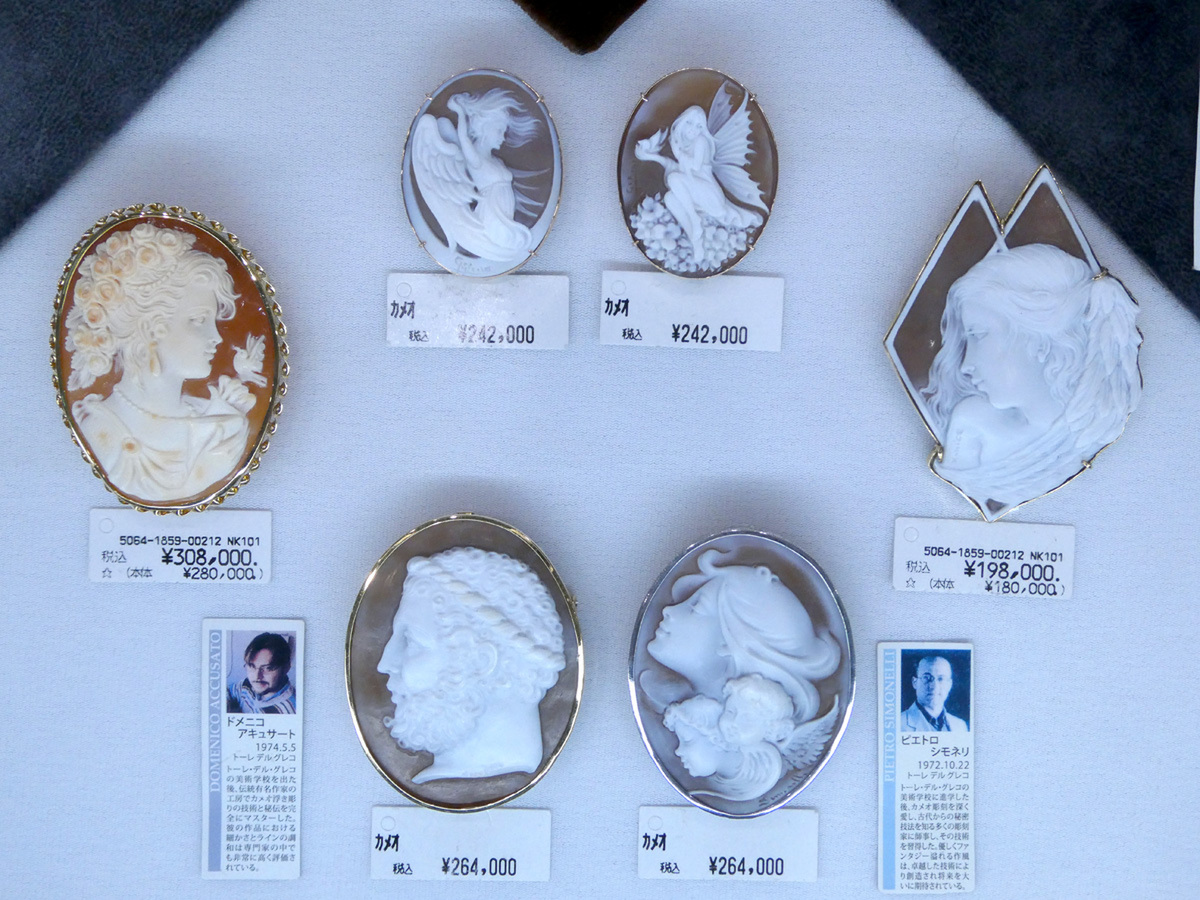 アクセサリー類も充実しており、カメオや金製品など、多数の職人によるアイテムを展示。嫌みがなく、それでいてきちんとその存在を主張してくるアクセサリーが多いように感じた