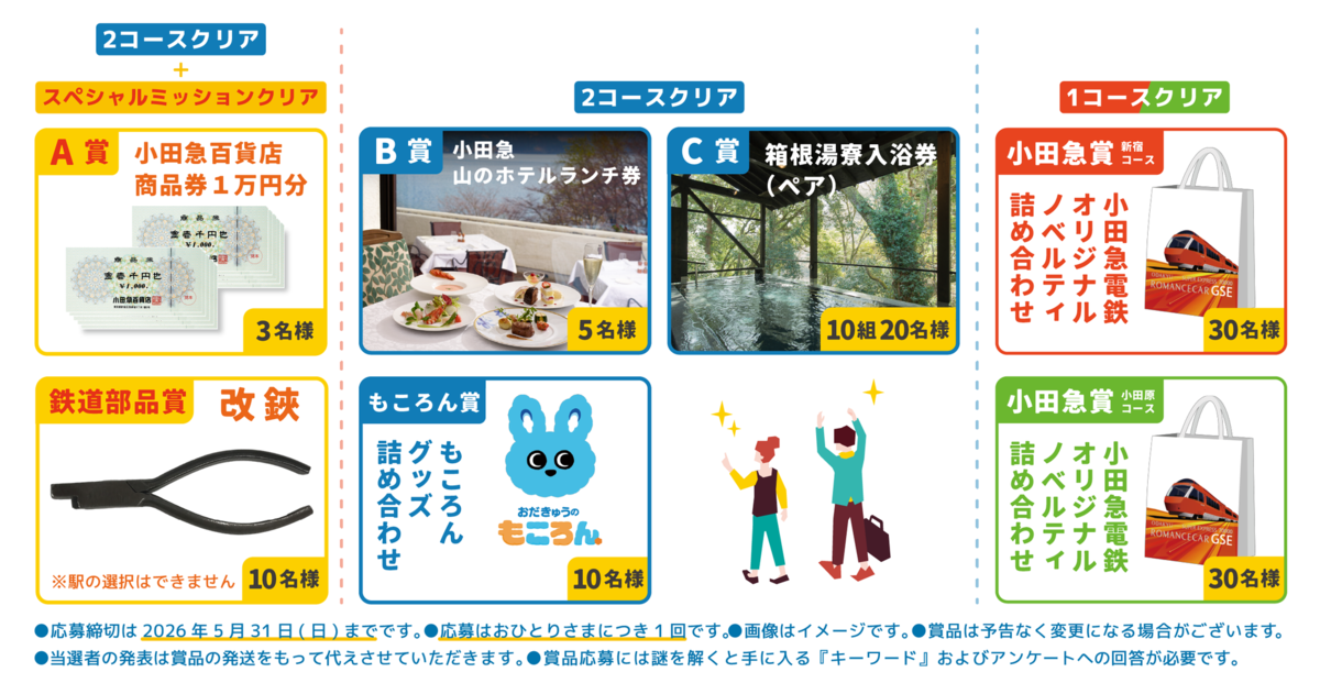 クリアすると小田急百貨店の商品券や山のホテルランチ券、もころんグッズ詰め合わせなど、豪華賞品が当たる抽選に参加できる。大人が1日全線乗り降り自由になる「1日全線フリー乗車券」や子供向けの「小児IC運賃」を利用してお得に楽しみたい。