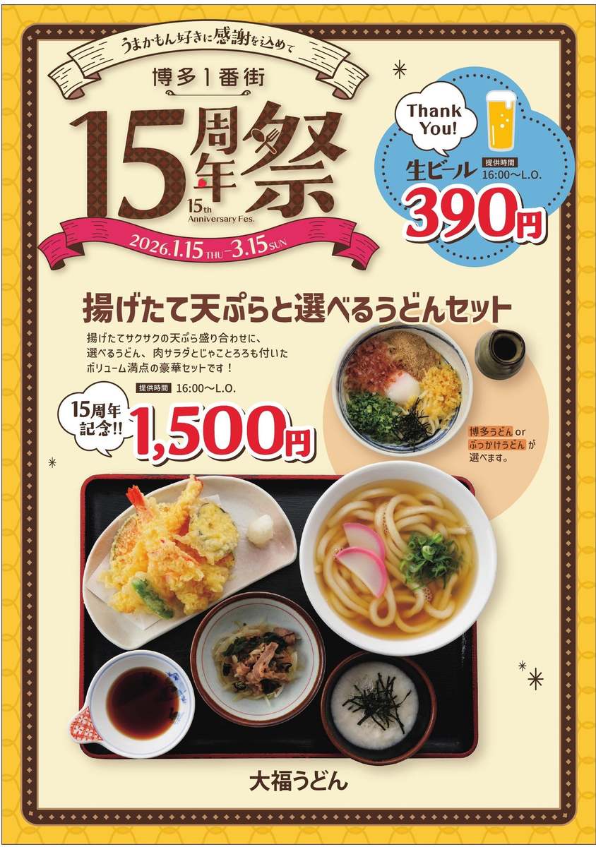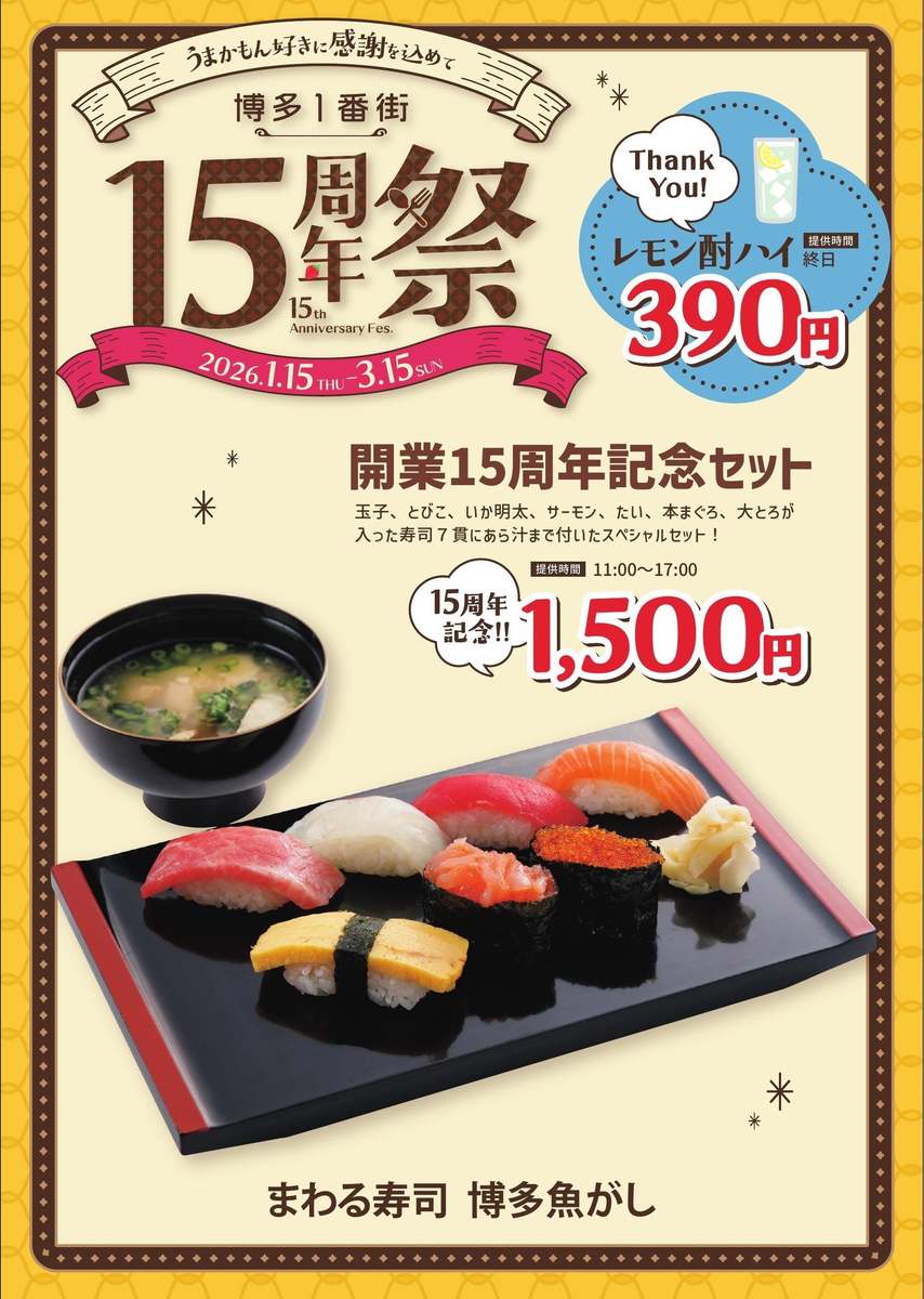 2026年3月15日まで、博多1番街で「博多1番街15周年祭」が開催中。開業15周年を迎えたことを記念して、1,500円の均一特別メニューや金券が当たるスクラッチキャンペーンなどを用意している。