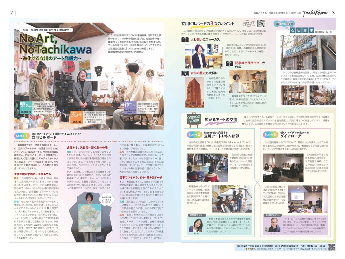 1月25日号では「立川文化芸術のまちづくり協議会」を特集。「No Art, No Tachikawa」をテーマに、Webメディア「立川ビルボード」など3つの活動を紹介し、「支え手」「繋ぎ手」「作り手」の視点から立川アートの魅力に迫ります。