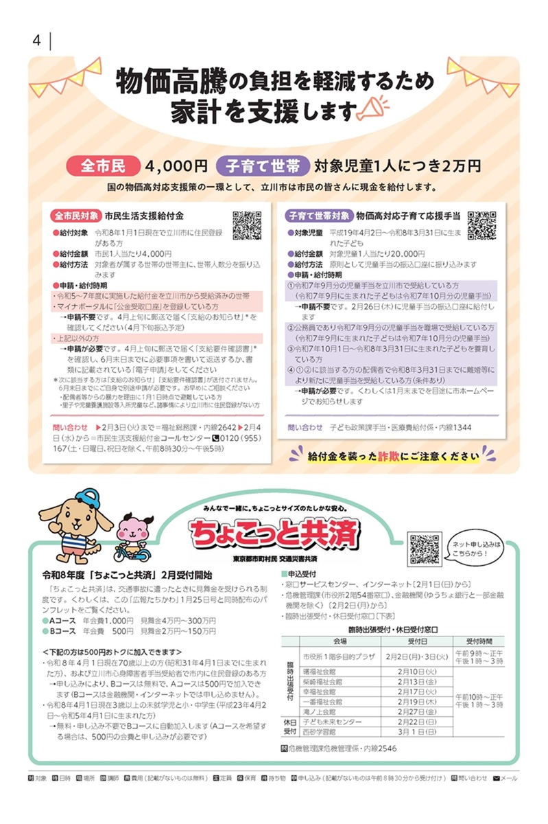 また、物価高対応支援策となる市民へ現金給付の案内や、交通事故に遭ったときに見舞金を受けられる「ちょこっと共済」についてお知らせしています。