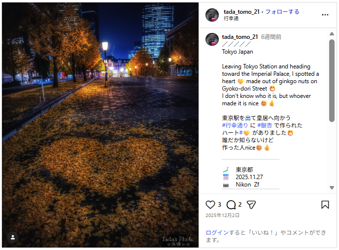 海の砂浜に文字やイラストを描いたりするのは度々ドラマでも見かけるシーンだが、なんとイチョウの落ち葉で形どったハートとは! 寒い冬に心が温まる作品で、しかも作者の仕込みではないことに驚いた。いずれ崩れてしまえど、タイミングよくここを通った人達には、ささやかなプレゼントになったに違いない。