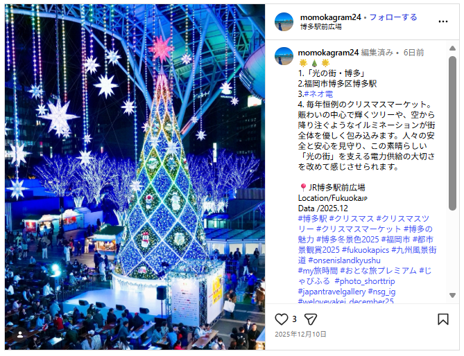 今や冬の風物詩といえるイルミネーション。博多や中洲、天神エリアで開催された「クリスマスアドベント」では、JR博多駅前の広場に巨大なクリスマスツリーが登場した。この角度からだと輝く星形イルミが、あたかも夜空に輝いているように見え可愛らしい。ツリーの下で冬のイベントを楽しむ人たちも表現された一枚。