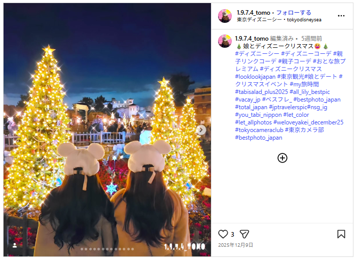 親子コーデで訪れた東京ディズニーシー。冬は園内がツリーやイルミネーションで一層華やかに彩られ、楽しさも倍増するだろう。左の大きいツリー側がお母さんで右は娘さん?いやいや、あえて逆?などと想像を膨らませてくれた。冬を楽しむ親子の姿がストレートに伝わってきた微笑ましい作品。