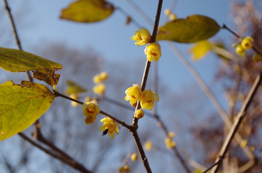 黄色く透き通ったようにも見える花を咲かせるこちらの植物は、「ロウバイ」です。