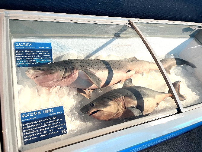 現在は、エラ孔が7対とサメの中で最も多く古代ザメの特徴をもったエビスザメと、ホホジロザメと同じ科に分類されるネズミザメの胎仔を展示中です。