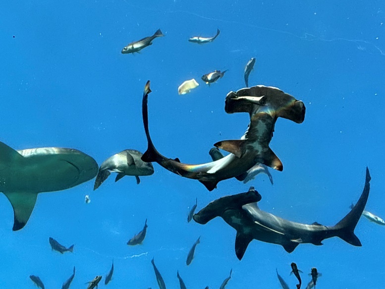 ここでは、頭の形が特徴的なアカシュモクザメや、先端が黒いヒレをもつツマグロをご覧いただけます。アーチ水槽のためサメたちが頭上を遊泳しており、見上げるとまさにスキューバダイビングで自分が潜っているような景色が広がります!
