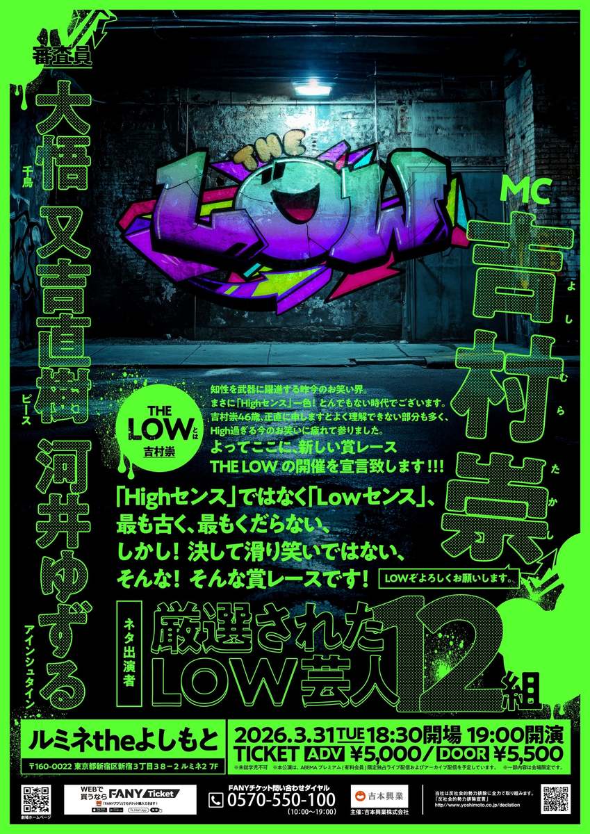 2026年3月31日、ルミネtheよしもとで新しいお笑い賞レースイベント「THE LOW」を開催する。主催と司会は平成ノブシコブシの吉村崇が務める。前売チケットは5,000円、当日の入場は5,500円。