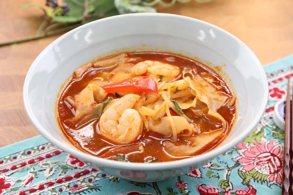 味の素・キユーピーの商品と鹿児島の産品を使って、「赤い」「熱い」「山盛り」をイメージした6つのレシピを提案。味の素のレシピ「餃子の皮で簡単マグマ麻辣湯」は、トレンドの麻辣湯を餃子の皮でアレンジ。餃子の皮がマグマに浮かび、いまにもボコボコと音を立てそうだ。