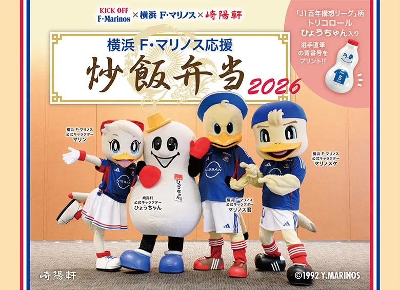 2月21日(土)浦和レッズ戦を、お弁当が盛り上げます。愛され続ける崎陽軒の「炒飯」をメインに、人気のおかずを詰め合わせ、J1百年構想リーグ限定の掛け紙をまといました。F・マリノス愛の詰まった「横浜F・マリノス応援炒飯弁当 2026」を食べて、横浜F・マリノスの試合をお楽しみください。