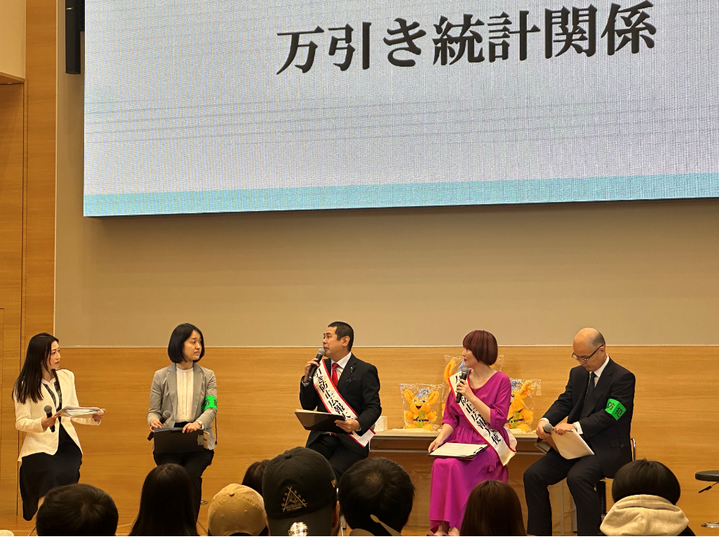 ノッチ・佐藤友美夫妻は警視庁生活安全総務課の管理官と少年相談専門職員とともに、「万引きをしたらどうなるのか・万引き統計」「万引き防止のために私たちができること」「万引きしてしまったときに私たちができること」の3テーマについてトークを繰り広げた。