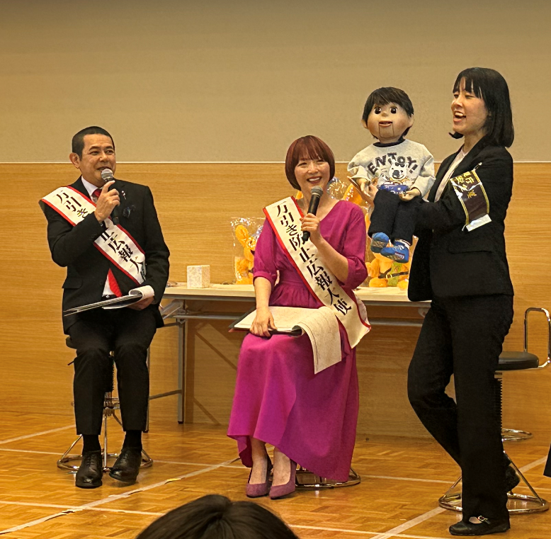 その後、トークセッションの内容を踏まえた万引き防止に関するクイズが出題され、会場は子どもたちの挙手の声であふれる。ノッチ・佐藤友美夫妻が回答する子どもを指すと、子どもたちは次々と正解。ピーポくんのぬいぐるみやタオルハンカチ、マグカップなどがプレゼントされた。子どもたちは和気あいあいとした雰囲気の中「万引きはしてはいけないこと」などの勉強ができているようだった。