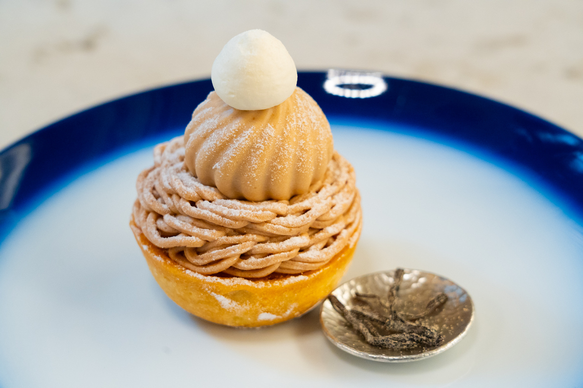 そして、甘党ならずとも試してほしいのが「モンブラン」。数々の試作を経て生まれたという逸品は、異なる質感と濃さのクリームが混ざり合い、栗の風味がしっかりと広がりつつも、甘すぎない絶妙なバランスに仕上がっています。 驚いたのは、お皿の脇に「塩昆布」が添えられていること。「ケーキに塩昆布!?」と意表を突かれましたが、一口ごとに交互に味わうと、甘みと塩味の無限ループが完成。最後まで栗の風味を新鮮に感じられる演出に、満足感でいっぱいです。