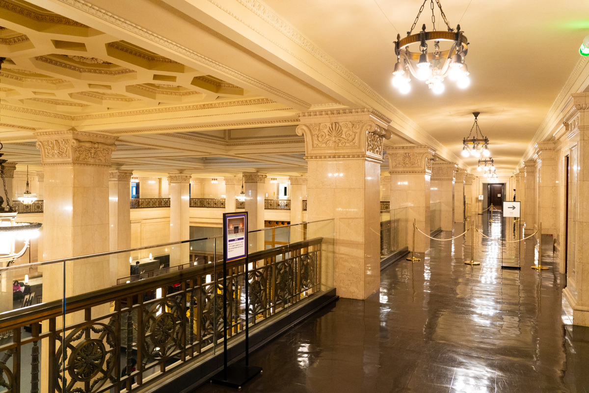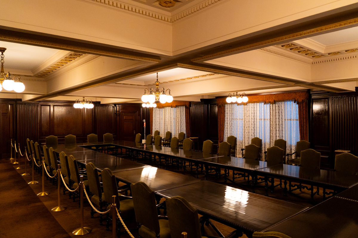 カフェを満喫した後は、ぜひ2階の一般公開エリアへ。 かつてGHQが接収し、ダグラス・マッカーサーも演説したと言われるこの場所。重厚な趣のあるデスクや石膏細工の天井は、どこを撮ってもフォトジェニックで、クラシック映画のセットに迷い込んだような高揚感に包まれます。