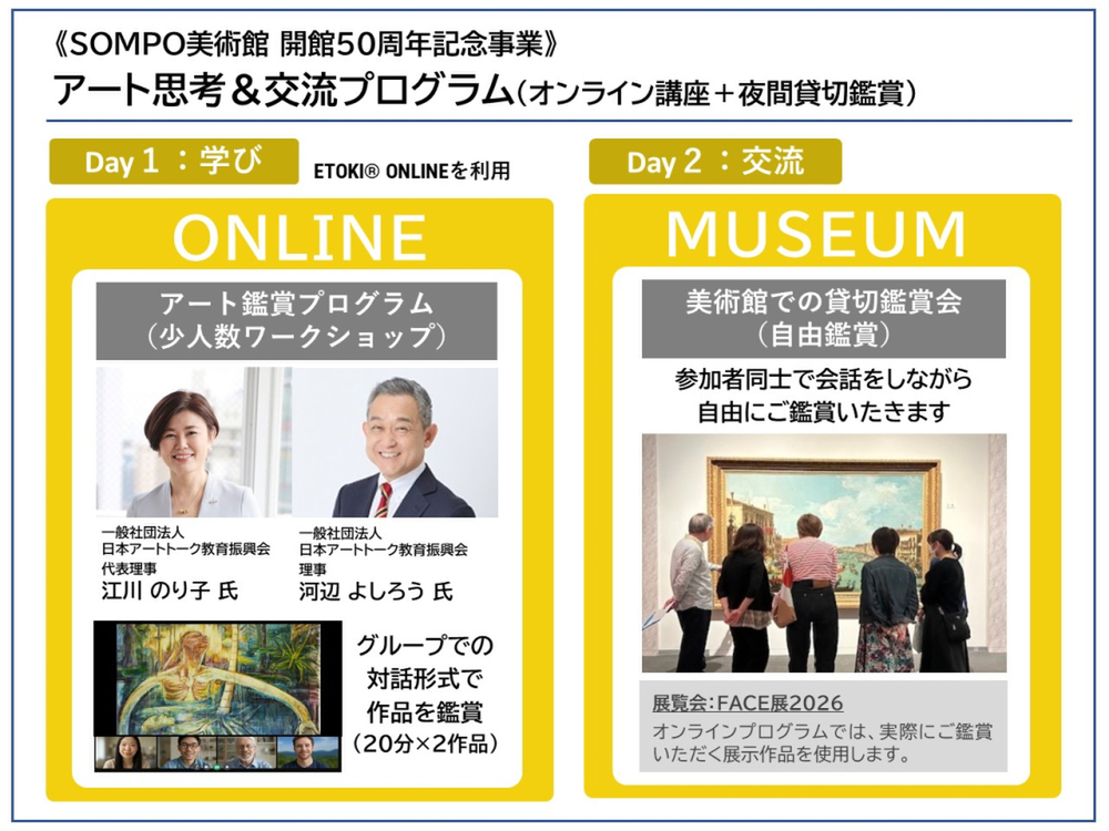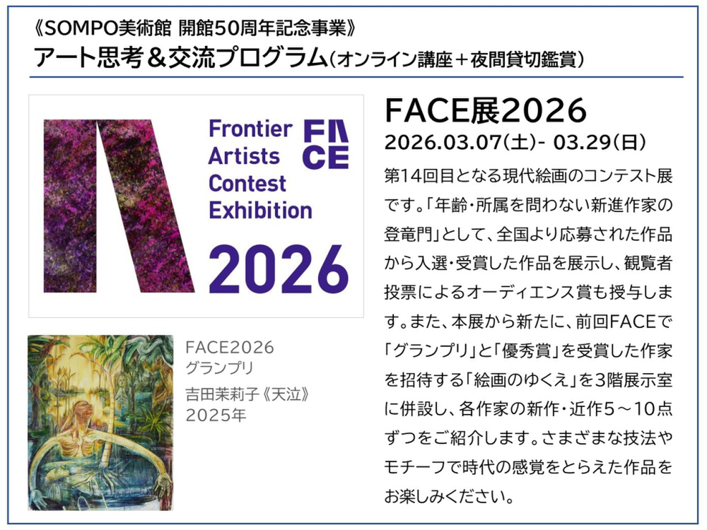 Day2の開催は3月13日。閉館後の美術館を貸し切って特別鑑賞会を行う。SOMPO美術館にて開催中の「FACE展2026」を、会話しながらゆったりと鑑賞できるところが魅力。18時半からの開催なので、仕事帰りにも参加できそうだ。申し込みはこちらから。
