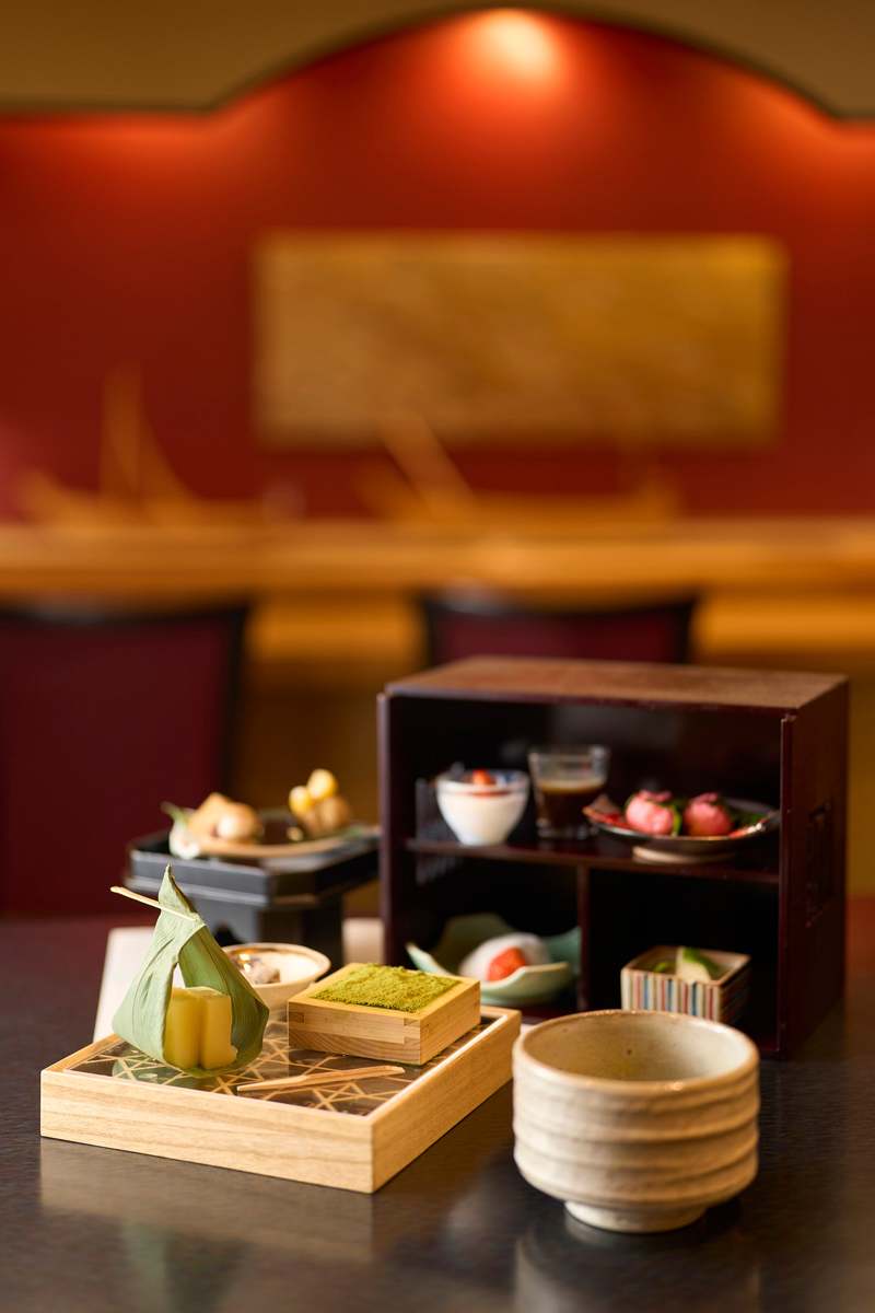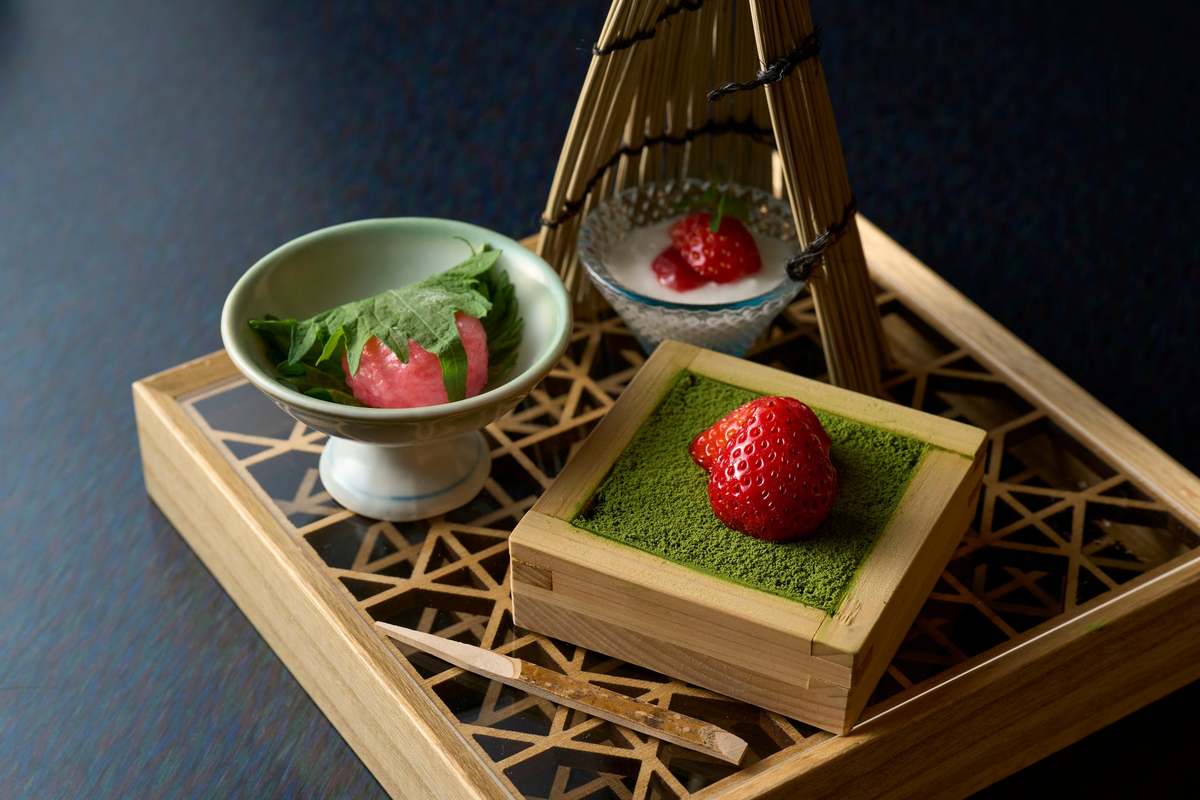 和菓子づくりの経験を持つ若手スタッフと甘味好きのスタッフ2名が共同で考案した「旬彩甘茶~淡雪~」。中でも「いちご大福」は、甘酸っぱいいちごと和三盆を用いたあんこを求肥で包んだ逸品だ。しっとりした口当たりと濃密な甘みを持つ紅はるかを使った「季節の羊羹」や「抹茶ティラミス」など、さまざまな味わいが楽しめる。塩昆布も添えられ、口直しにもぴったり。