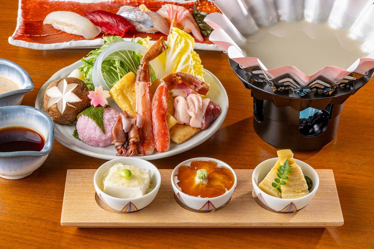 前菜は出汁のジュレを添えた「自家製豆腐」、繊細な甘さの「汲み上げ湯葉」、旬の筍と歯ごたえの良い鳴門若布の「若竹煮」の3種。メインの豆乳鍋は、鰹節と昆布の出汁を上品にきかせ、蟹や合鴨、蛍烏賊、桜葉の香りがふわりと広がる桜道明寺や生桜麩、季節野菜などが楽しめる。胡麻だれやポン酢と一緒に味わいたい。職人が握る寿司5貫、特製デザートとオーガニックティーも見逃せない。