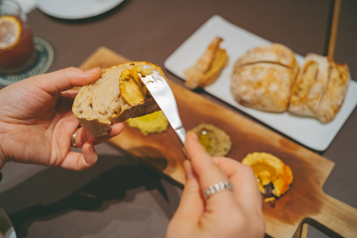 前菜は軽めにスタートして、石窯料理はメインでしっかり楽しもうと思っていたのですが、添えられていた自家製リュスティック(パン)がまさかの石窯焼きでした! 石窯で焼かれた皮はパリッと香ばしく、中は驚くほどもちもち。大きな気泡が生地のうまみを物語っていて、シンプルなのに妙に後を引くおいしさです。オーブンで焼いたパンよりも外側の香ばしさと中のしっとり感のコントラストがはっきりしていて、パンだけでお酒が進みます。メインへの期待がぐっと高まる前菜になりました。
