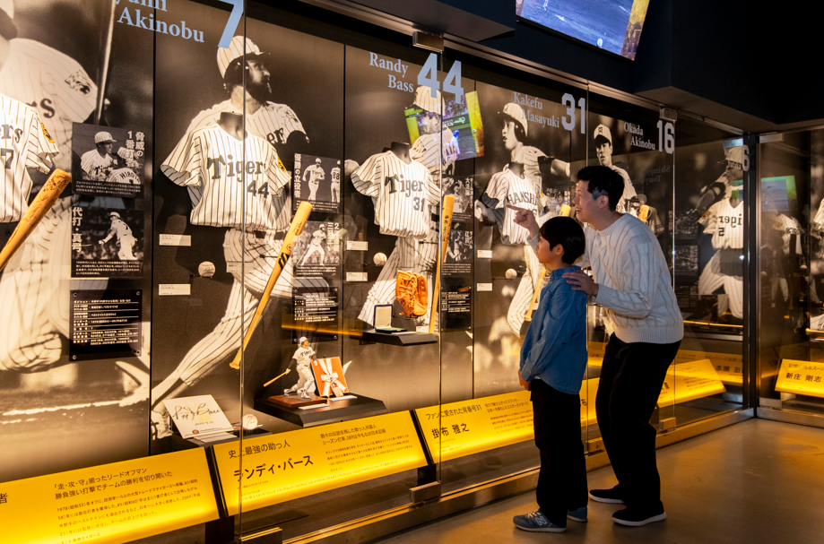 藤村富美男氏、村山実氏、吉田義男氏の永久欠番選手をはじめ、2025年に野球殿堂入りを果たした掛布雅之氏らの活躍ぶりを映像や展示品で紹介。歴代の名選手だけでなく、現在活躍中の選手が実際に使用したバットやグローブなども展示されている。