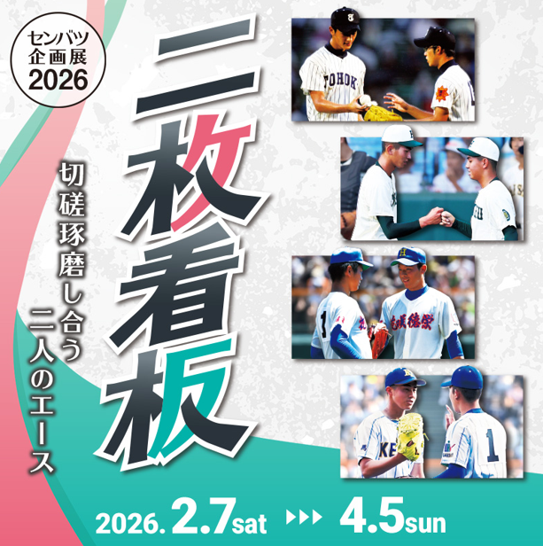 毎年恒例となるセンバツ企画展が4月5日(日)まで開催。今年のテーマは、「二枚看板」。同じチームで切磋琢磨し合う「二人のエース」の関係を紐解く内容になっている。東北高校のダルビッシュ有選手・真壁賢守選手や、報徳学園高校の今朝丸裕喜選手・間木歩選手などの代表的なダブルエースの紹介や、関連する野球道具が展示されている。