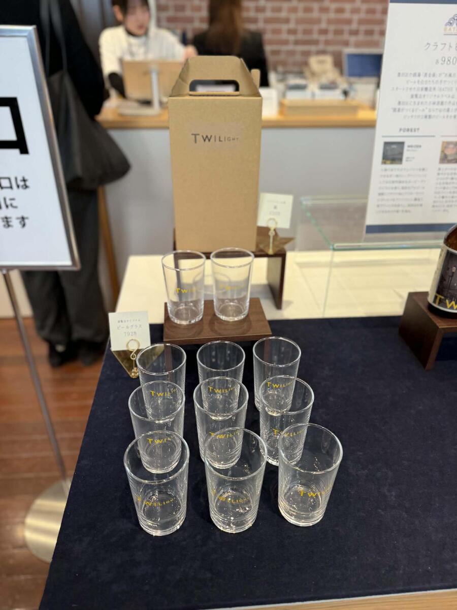 本展のタイトルを冠した「TWILIGHTグラス」(税込み792円)。斜光をイメージした黄色のロゴをあしらったビールグラス。ビールを注ぐと、TWILIGHTの文字が、黄金色のビールと溶けあう様子を楽しめる