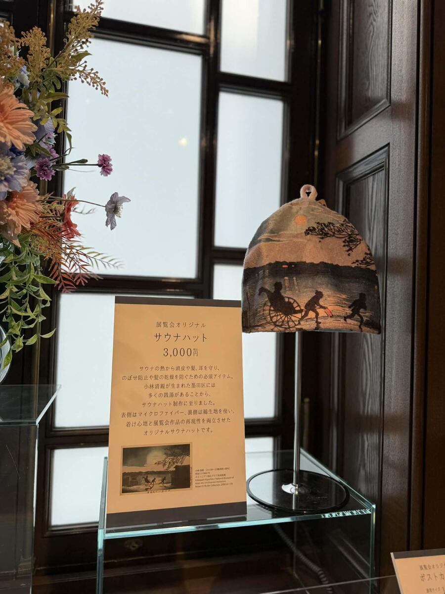 サウナハット(税込み3,000円)。サウナの熱から頭皮や髪、耳を守り、のぼせ防止や髪の乾燥を防ぐための必須アイテム、サウナハット。 小林清親が生まれた墨田区には多くの銭湯があることから、サウナハットの制作に至った。表側はマイクロファイバー、裏側は綿生地を使い、着け心地と展覧会作品の再現性を両立させたオリジナル商品。 TWILIGHTグラスとサウナハットは Store 1894のみで購入できる