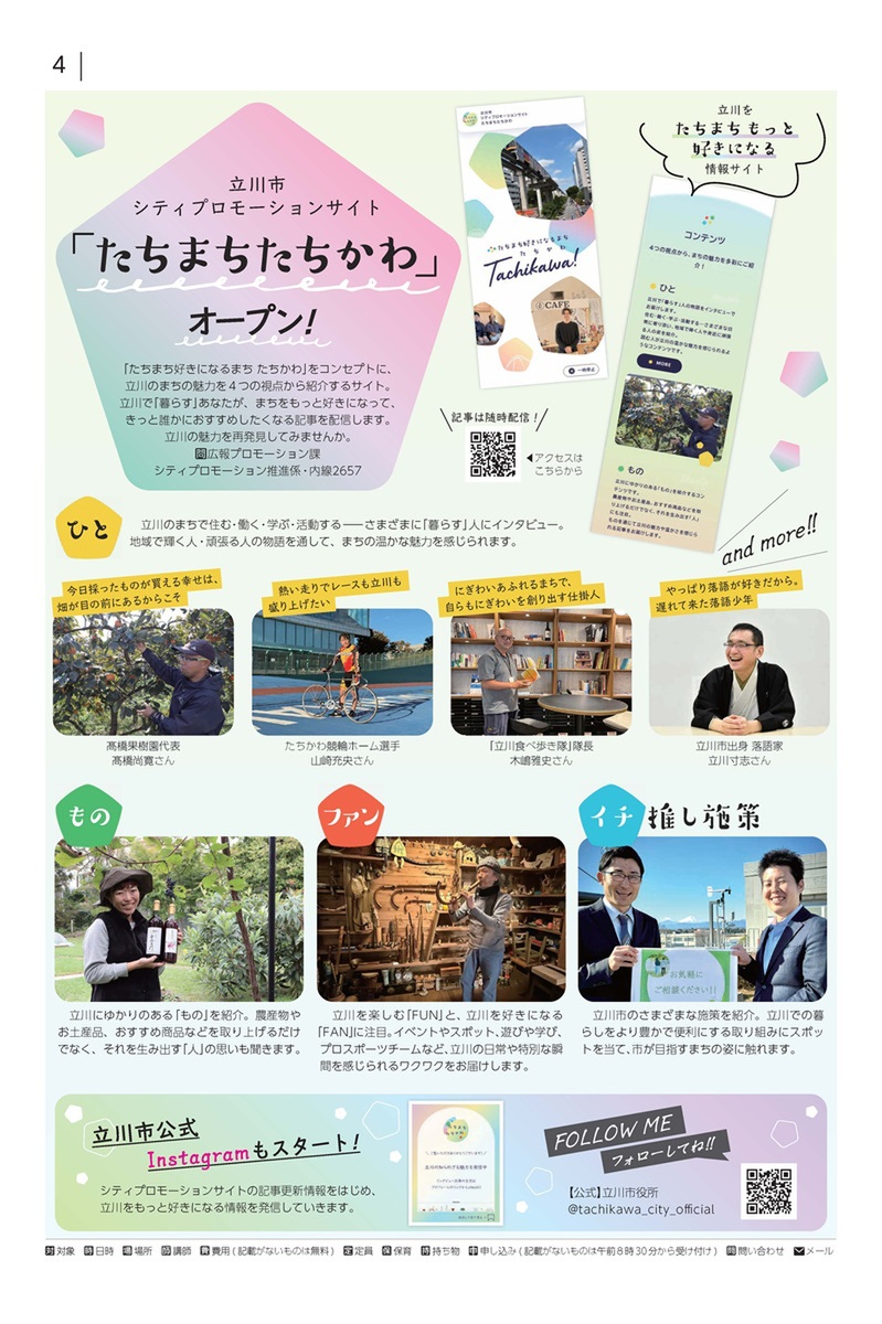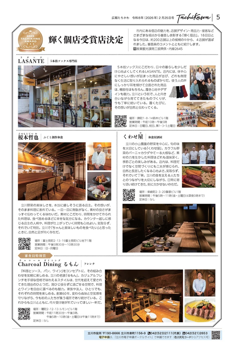 また、今号オープンしたシティプロモーションサイト「たちまちたちかわ」の案内や 、立川市内の個店をさまざまな視点から審査し表彰する「輝く個店」の第18回受賞店(4店舗)をお知らせしています。