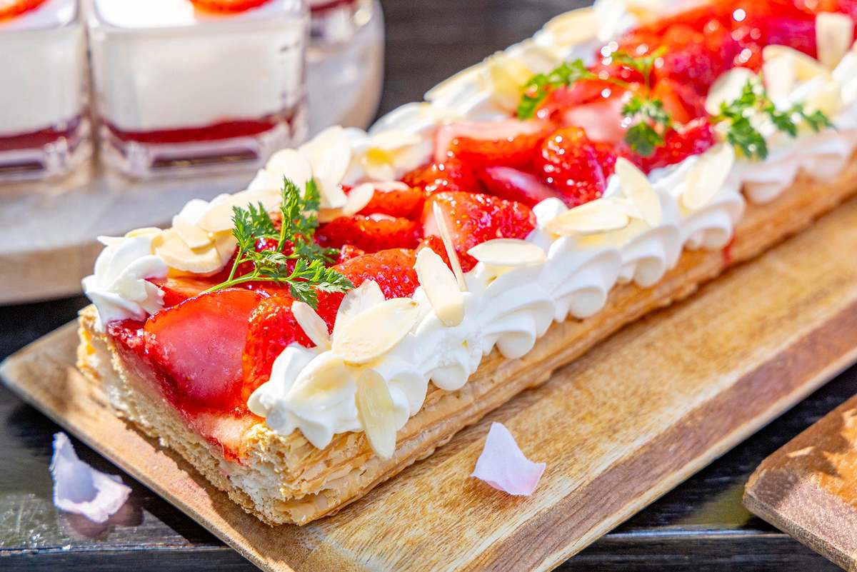 メインは「真鯛の鉄板グリル」や「本日のパスタ」など4種類からセレクトOK。「本日のサラダ」と一緒に楽しんだら、いちごが主役の様々なスイーツが楽しめるビュッフェへ。ストロベリーパイやクレームダンジュ、フレンチトーストなどがラインナップされている。フリーフロードリンクも付いていて、「イチゴのアイスラテ」や「イチゴとバラのノンアルコールスパークリング」などいちご尽くし!