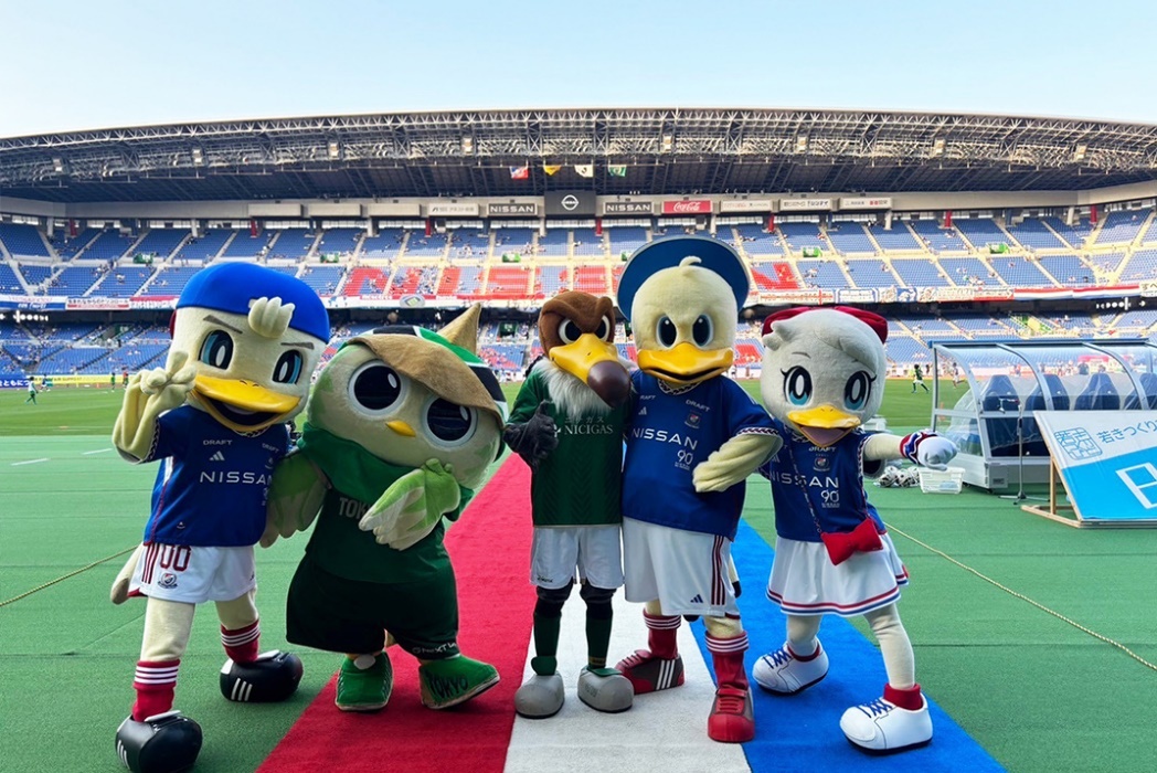 本試合の対戦相手、東京ヴェルディの公式マスコット、ヴェルディ君とリヴェルンが日産スタジアムにやってくる!当日はマリノス君、マリノスケ、マリンと共にスタジアムで皆さまをお迎えします。