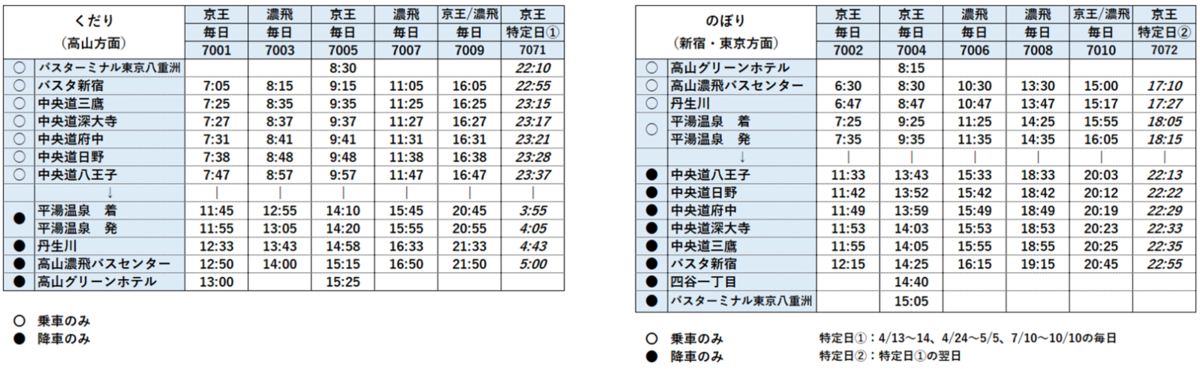 2026年4月1日から京王電鉄バスの高速バス「新宿~飛驒高山線」のダイヤ改正と座席サービスの変更を実施する。バス停「バスターミナル東京八重洲」および「高山グリーンホテル」発着便が増加し、午後の新宿発便は16時台に変更する。