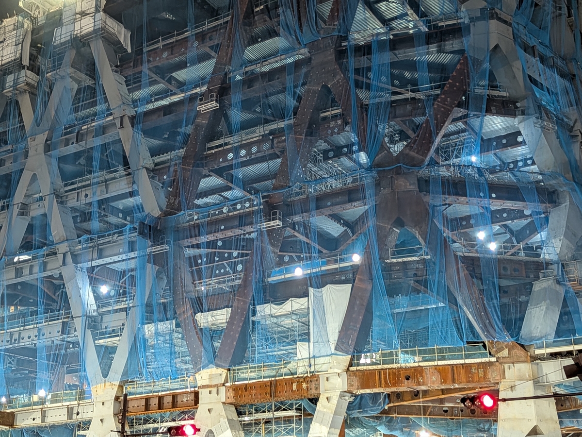 Torch Towerは地上62階、地下4階、高さ385mを誇り、完成すれば日本一高い超高層ビルとなります。構造面では、超高層かつ超大型建築に対応するため、外殻制振構造による高強度鉄骨を用いた制振構造が採用されています。9階床、高さ約52メートルまでの低層部には「ダイヤグリッド架構」と呼ばれる巨大な斜め鉄骨柱を配置し、斜めに配置された鉄骨の柱や梁で構成する三角形フレームが地震や風揺れを抑えるほか、象徴的な外観ファサードを形成します。また、9階床よりも上層階は斜め部材によるブレース架構とオイルダンパーを組み合わせた構造となります。ダイヤグリッド架構の鉄骨断面は1.4メートル×1.6メートル、最大板厚90ミリメートルとなっており、現代の鉄骨工事・製作で合理的に可能な最大級の大断面となっています。さらに低層部のダイヤグリッド架構の鉄骨総重量約1.1万トン、タワー全体は約80万トンという驚異的な重量を誇る超高層ビルとなります。