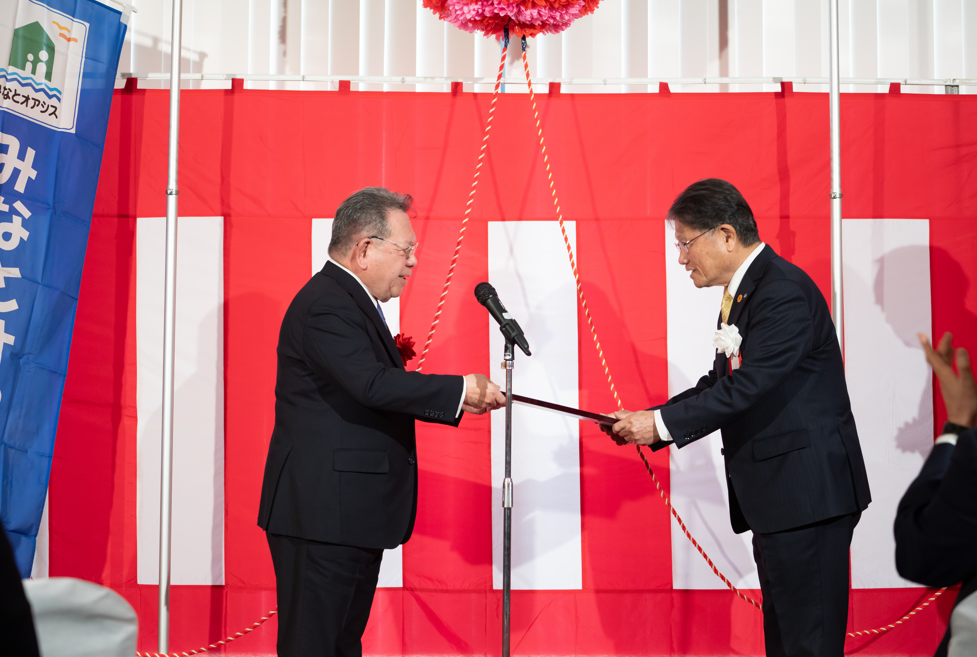 演奏のあとは、南知多町の石黒和彦町長、髙田順平副町長による挨拶と概要説明があり、「みなとオアシス師崎」の登録証交付式が行われた。そもそも「みなとオアシス」とは、港を核とした住民交流や観光振興の拠点として国土交通省港湾局長が申請に基づき登録を行う制度。愛知県では、蒲郡市、田原市、知多市に続く4番目の登録となった。当日は酒井庸行国土交通副大臣が出席し、南知多町長へ「みなとオアシス師崎」の登録証が手渡され、みなとオアシスの仲間入りを果たした。