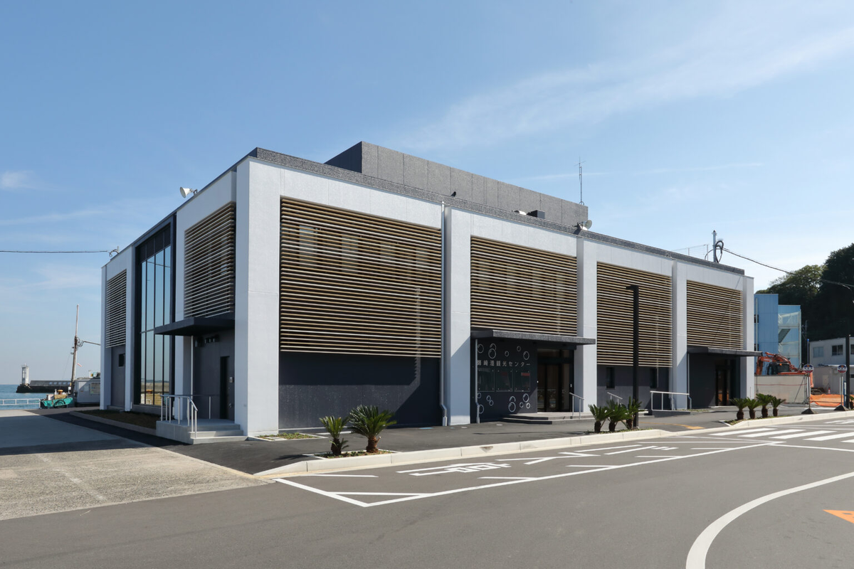 師崎港は、もともと篠島・日間賀島への海上交通の拠点として機能していた。今回リニューアルオープンした師崎港観光センターは、海上交通拠点としての役割はそのままに、観光施設、地域住民の交流の場、防災支援機能等を備え、「ひと・モノ・地域」を結ぶ南知多町の次世代の「らしんばん」となることを目指しており、一般的な港とは一線を画した施設。