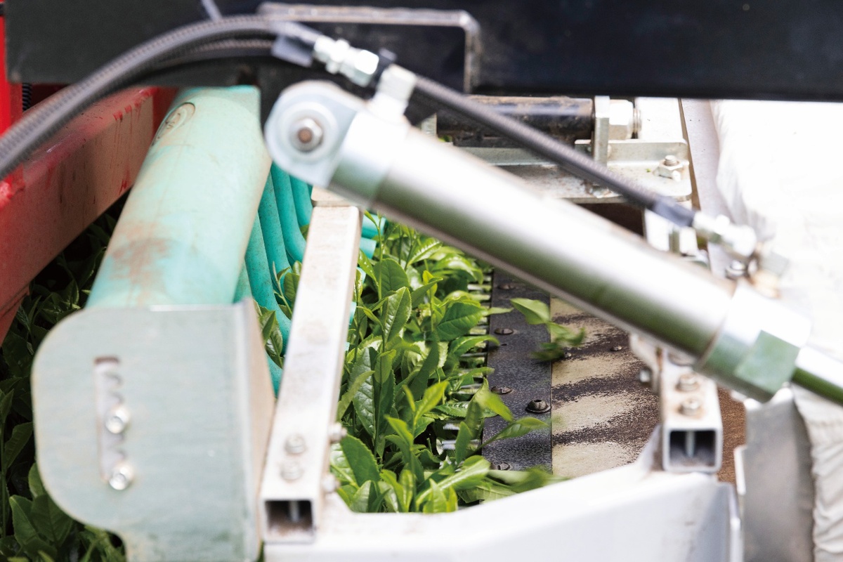 野村さんの茶畑を訪ねたのは、昨年6月の晴れた日。4000坪にも及ぶ広々とした茶畑で、刈り取り機を使い、二番茶を摘採(てきさい/刈り取り)しているところでした。