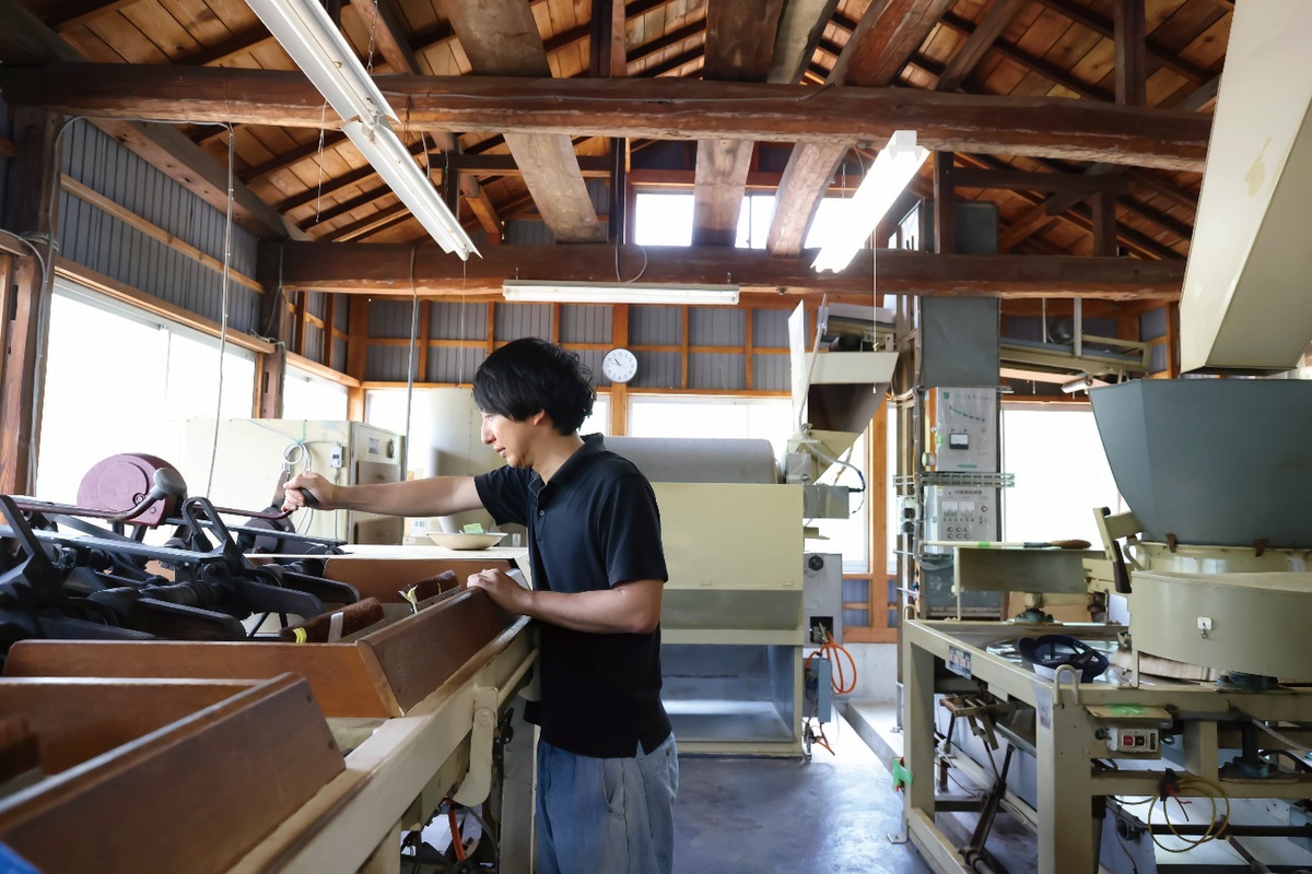 こうして丹精込めて育てられた茶葉はそのまま出荷される? いえ、狭山は小規模な茶園が多く、製茶まで自社で行うのが主流で、野村園もその一つ。摘採した茶葉は翌日までに製茶されます。「最初は“蒸し”。蒸気を満たした回胴式蒸機に茶葉を入れ、回転させながら蒸します。次は“粗揉”。蒸した茶葉に熱風を当て、揉み込みと攪拌(かくはん)をしつつ水分を出す工程を2回繰り返します。それから“揉捻(じゅうねん)”。茶葉に重しをかけて揉み込み、茎や葉などの部位によって異なる水分を均等にするんです」