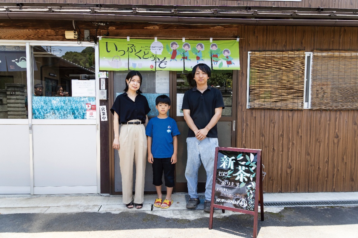 野村翔一さん(42歳)…1945年創業の野村園3代目。2013年にサラリーマンから転身して家業を継ぎ、日本茶文化の発信に尽力し、日本茶インストラクターの資格も持つ。茶葉の栽培から製茶までを一貫して手掛け、農園併設のショップやネット販売にも取り組む。写真は奥さまと息子さんと共に。