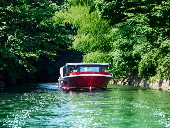 この三方五湖を船上から満喫できるのが、三方五湖ネイチャークルーズだ。国内初の再生可能エネルギーによる電池推進遊覧船で巡る環境配慮型クルーズで、太陽光発電の電気を活用し、CO₂や排気ガスを出さず静かに航行。久々子湖を出発し、浦見川を通過して水月湖を巡る50分のコースでは、進むごとに変化する湖の色や景色をゆったり楽しむことができる。