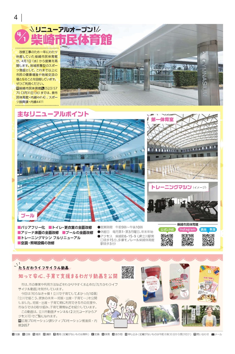 また、4月1日にリニューアルオープンする「柴崎市民体育館」や、立川市の事業や利用方法などをまとめた「たちかわライフサイクル動画」について紹介しています。