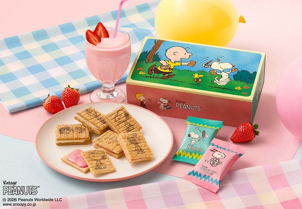 新作の『ストロベリーシェイク風』は、あまずっぱいストロベリーショコラを国産生乳の練乳パウダーを合わせたシリアル生地でサンドし、ひとくちで爽やかな味わいが楽しめる。また、この商品はコラボレーションデザインとして、お菓子と個包装にスヌーピーとその仲間たちがあしらわれており、それぞれランダムにデザインが入っている。