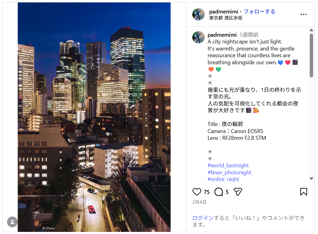 「この度は選んでいただき、ありがとうございました。旅行先の東京、マジックアワーの時をゆっくり過ごせた幸せな撮影でした。見ていただいた方々のどなたかに、何かが伝わり寄り添えたなら嬉しく思います。」