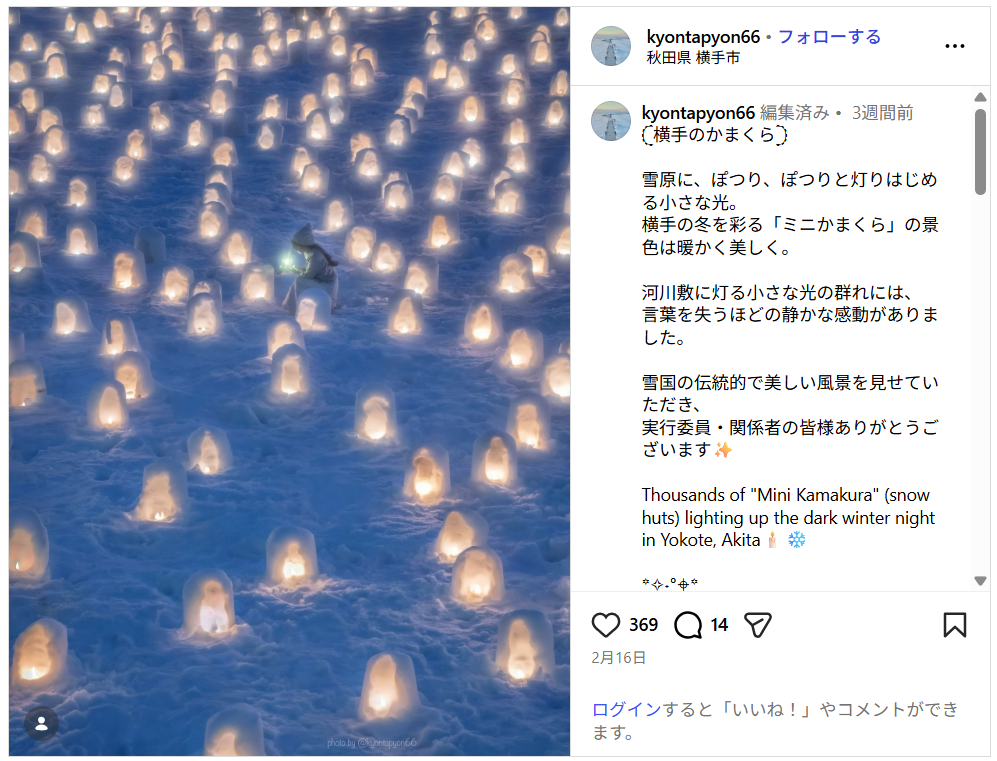 「この度は素晴らしい賞をいただき、大変光栄です。秋田・横手の雪灯篭まつりは、私にとってずっと憧れだった場所でした。凍てつくような寒さの中でも、そこには確かに『横手の暖かい光』が宿っていました。その時に感じた心の震えや、ずっと行きたかった場所に立てた喜びをこの一枚を通して皆さまにも伝われば幸いです。」