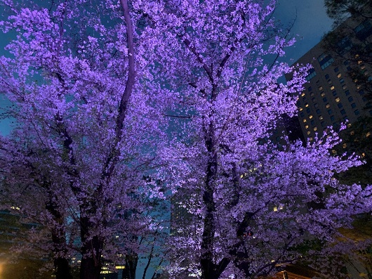 昼の桜とは異なり、都会の風景とライトアップされた和風の桜が魅力的です。