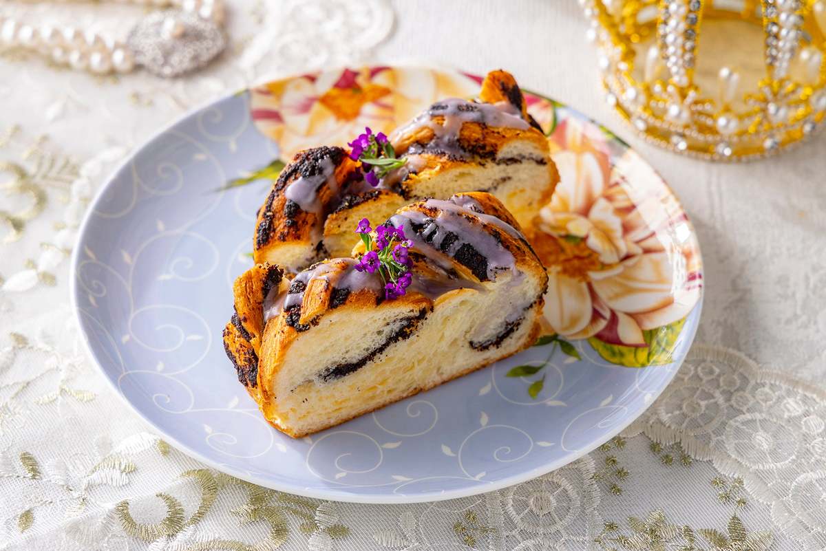 オーストリアやドイツ、チェコなどで親しまれている「モーンデニッシュ スミレアイシング」は、デニッシュ生地にケシの実ジャムペーストを編み込み焼き上げた一品。「シトラスミントのクグロフ」は、卵とバターをたっぷり用いたブリオッシュのリッチな味わいに甘酸っぱいシトラスミントの風味が初夏のベルサイユ宮殿をイメージさせる。
