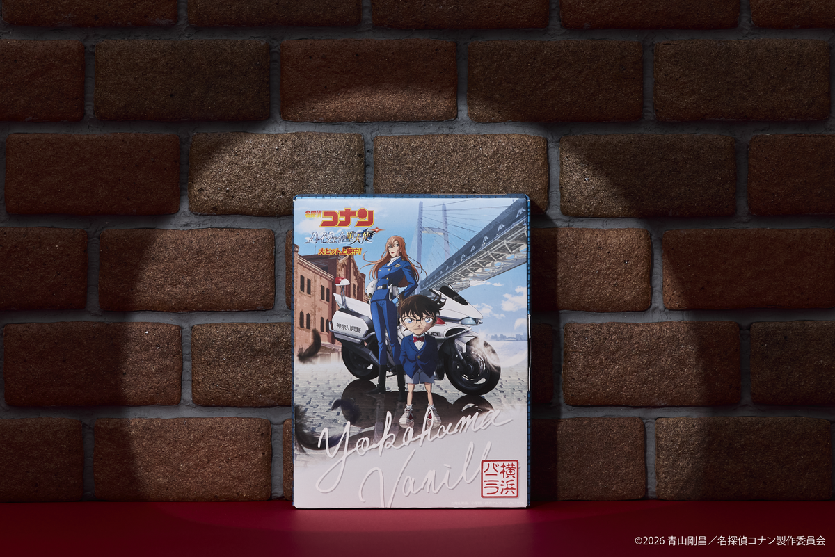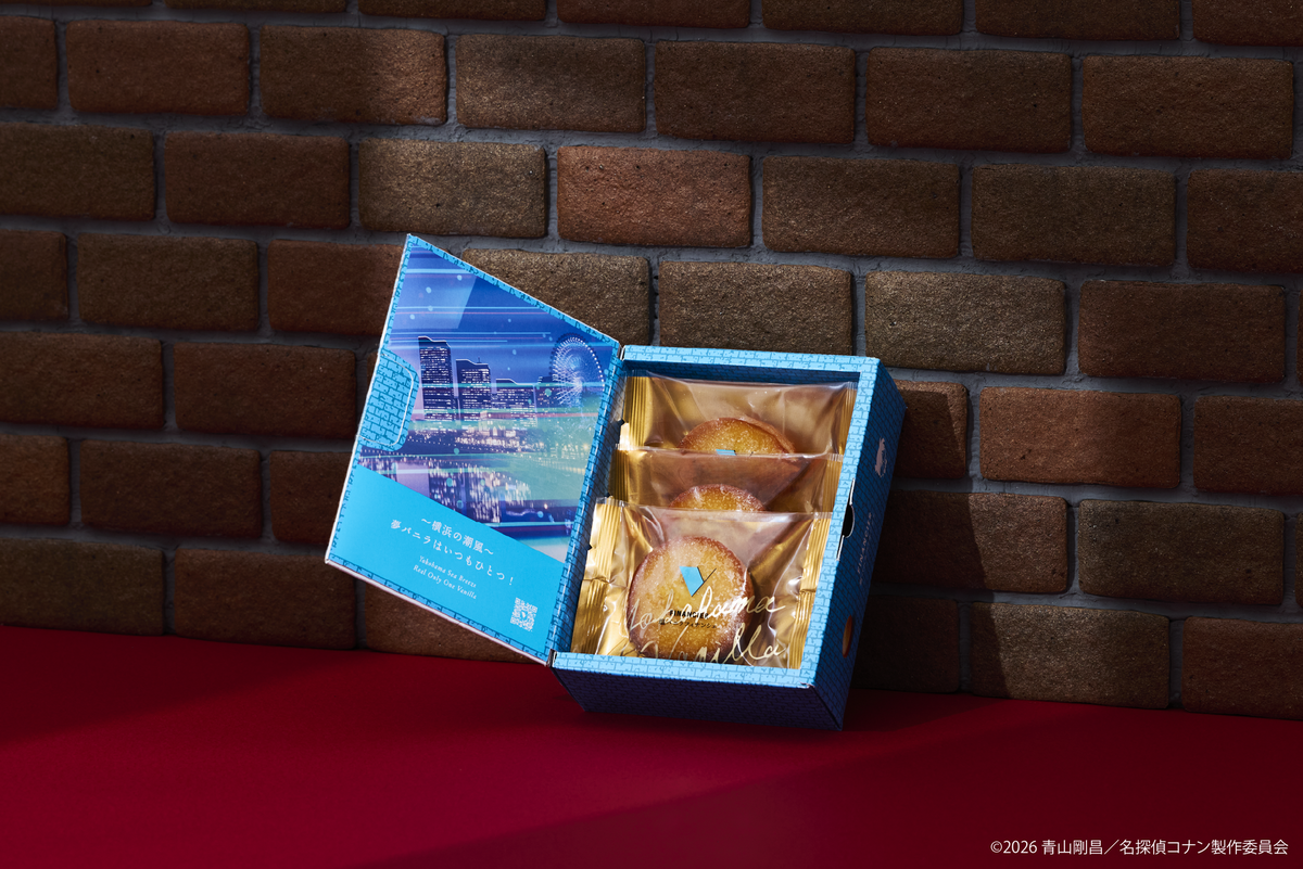 今回のコラボパッケージは劇中に登場する横浜を背景にしたデザインで、江戸川コナンと萩原千速が描かれている。ブランドカラーのブルーを基調に、側面には作品を象徴するレンガ模様があしらわれ、作品の世界観と横浜の風情を巧みに表現した。名探偵コナンファンやスイーツ愛好家に、横浜の魅力を感じてほしい一品である。