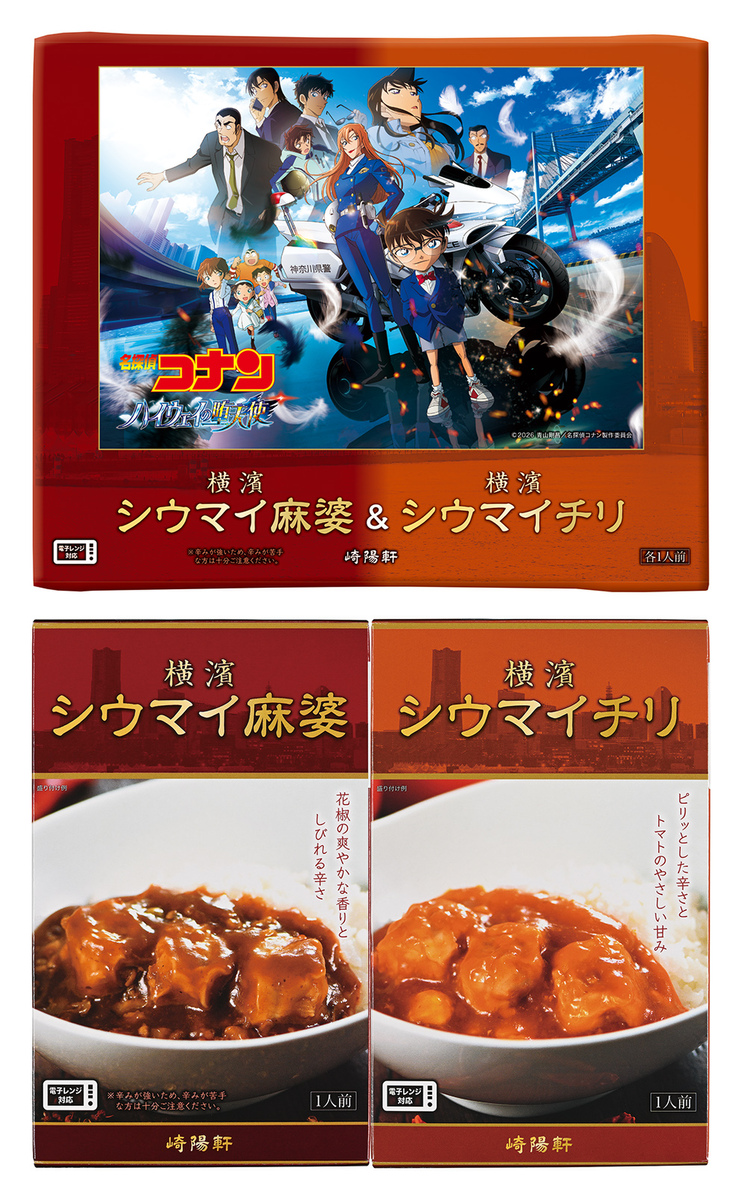 「横濱シウマイ麻婆&横濱シウマイチリ」は、シウマイがゴロッと入ったレトルト製品のセット。麻婆は花椒の爽やかな香りと痺れる辛さが特徴で、一方、チリはピリッとした辛さとトマトの優しい甘みが楽しめる。どちらも電子レンジで温めてごはんにかけるだけで、手軽に本格中華を味わえる便利な仕様となっている。外包装には、劇場版の舞台となる横浜と作品の世界観を表現した特別デザインが採用されている。