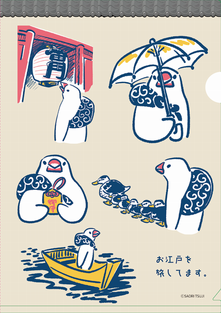 多数のクリエイターやメーカーによる文鳥グッズが一堂に会する。会期中には税込3,300円以上購入した先着1,000名に、「ふろしき文鳥」を手掛ける辻佐織氏のイラスト入りA5クリアファイルをプレゼント。ファイルのデザインは前半と後半で異なり、各500名分。