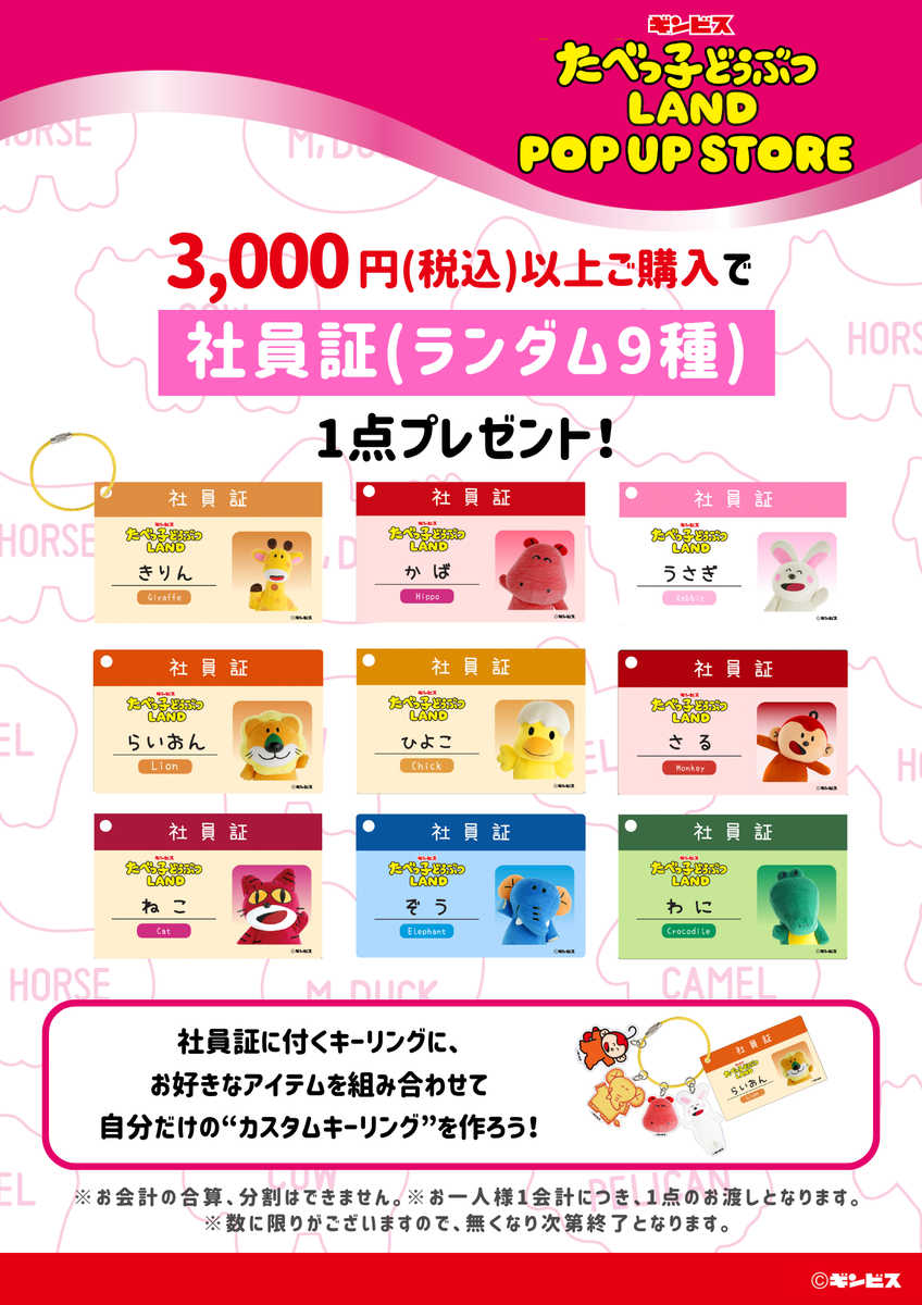 注目はぷくぷくシール(全2種・各770円 税込)。どうぶつキャラクターはもちろん、ビスケットの形をしたシールもあり、ついつい購入してしまいそう。3,000円以上購入すると、どうぶつさんの「社員証」キーリングをランダムでプレゼント。
