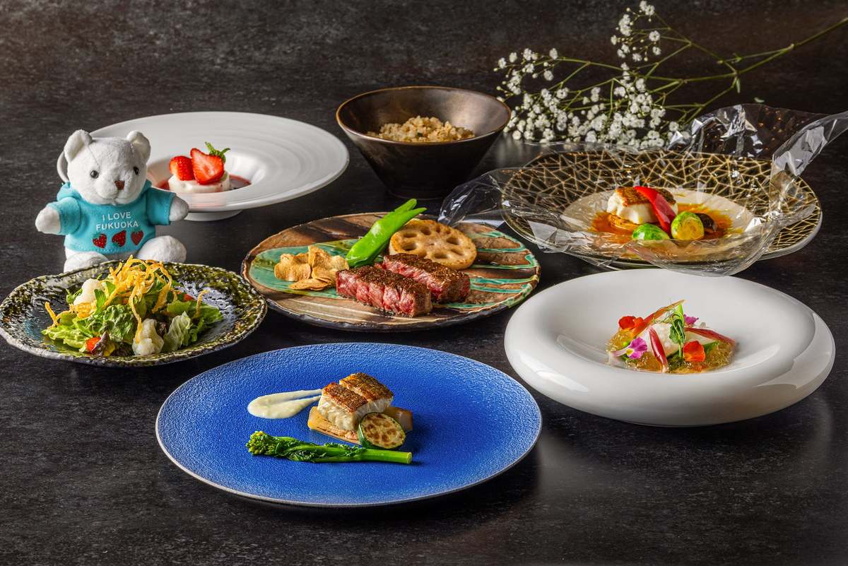 鉄板焼「金葉亭」では、「熊本県産のあか牛サーロイン」や「スズキとホワイトアスパラのクレピネット 春野菜添え」をメインとした7品のコースが登場。ホテル最上階から福岡の美しい景観を望みながら味わえるので、特別な気分で過ごせそうだ。価格は一人10,000円、ケーキ付きは12,000円。
