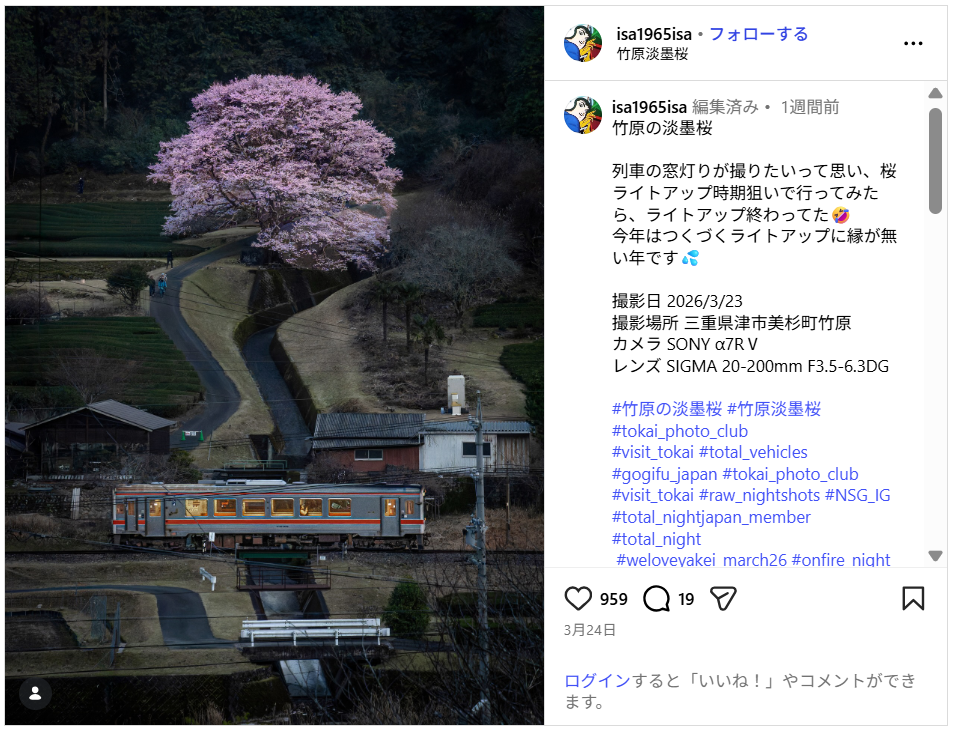 竹原の淡墨桜は、伊勢竹原駅から徒歩すぐの桜名所。JR東海・名松線の一両編成は本数も少ないので、列車の窓灯りを狙うとなると、時間的にも素晴らしいシャッターチャンスだ。ライトアップが終わっていたからこそ、逆に素晴らしい色合いの写真になっている。”別れと出会い”の瞬間のようなエモさを感じる。